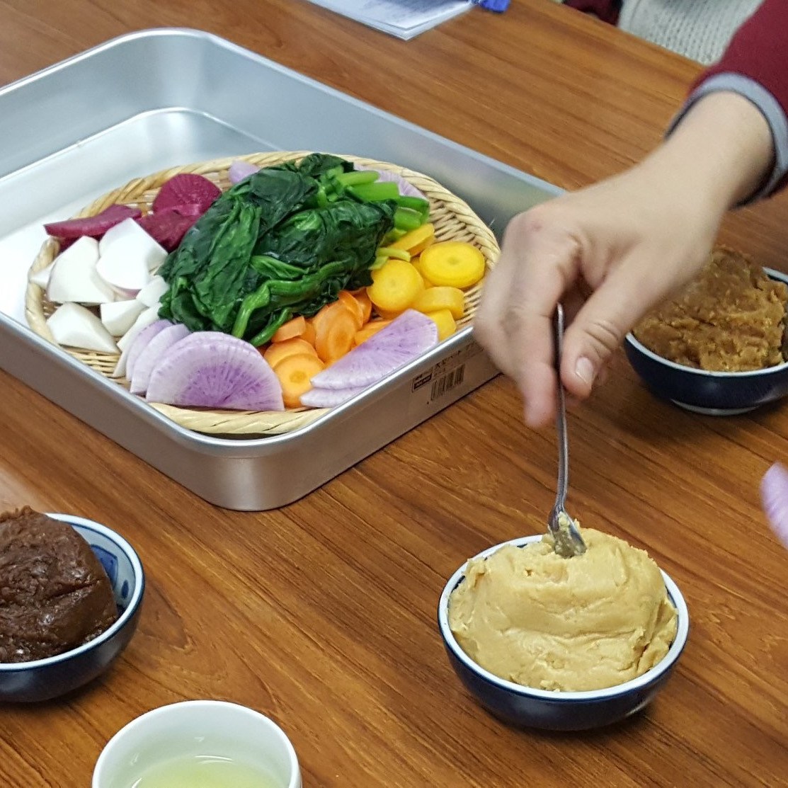 Akiko, well known for teaching foreigners delicious Japanese vegan food, prepared some yummy vegan dishes with miso and taught us how to properly make miso soup. Mr. Inoue, a professional miso-maker/chef and restaurant-owner in Kamakura lectured us about the process of making miso, the tradition and history, and how he is bringing those traditions into the future. He brought delicious organic vegetables from Kamakura, and 4 different kinds of Miso for us to taste and compare.