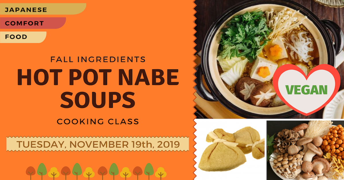 Come and learn 2 different kinds of traditional hot pot soups: a miso flavored base, and a soy sauce flavored base. Both soups can be used as a base for Ramen or just as the soup for the traditional Japanese comfort food “Nabe Ryori”. The soups will be made with a vegan broth, not the traditional fish broth but will be just as flavorful, perfect for those who dislike the fishy taste. We will add all of the traditional fall harvest ingredients, many of which are unknown to us non-Japanese nationals. It is a great opportunity to learn about the different kinds of mushrooms, greens, and other fall vegetables. Also, we will use a few varieties of tofu and show you creative ways of cooking with them.