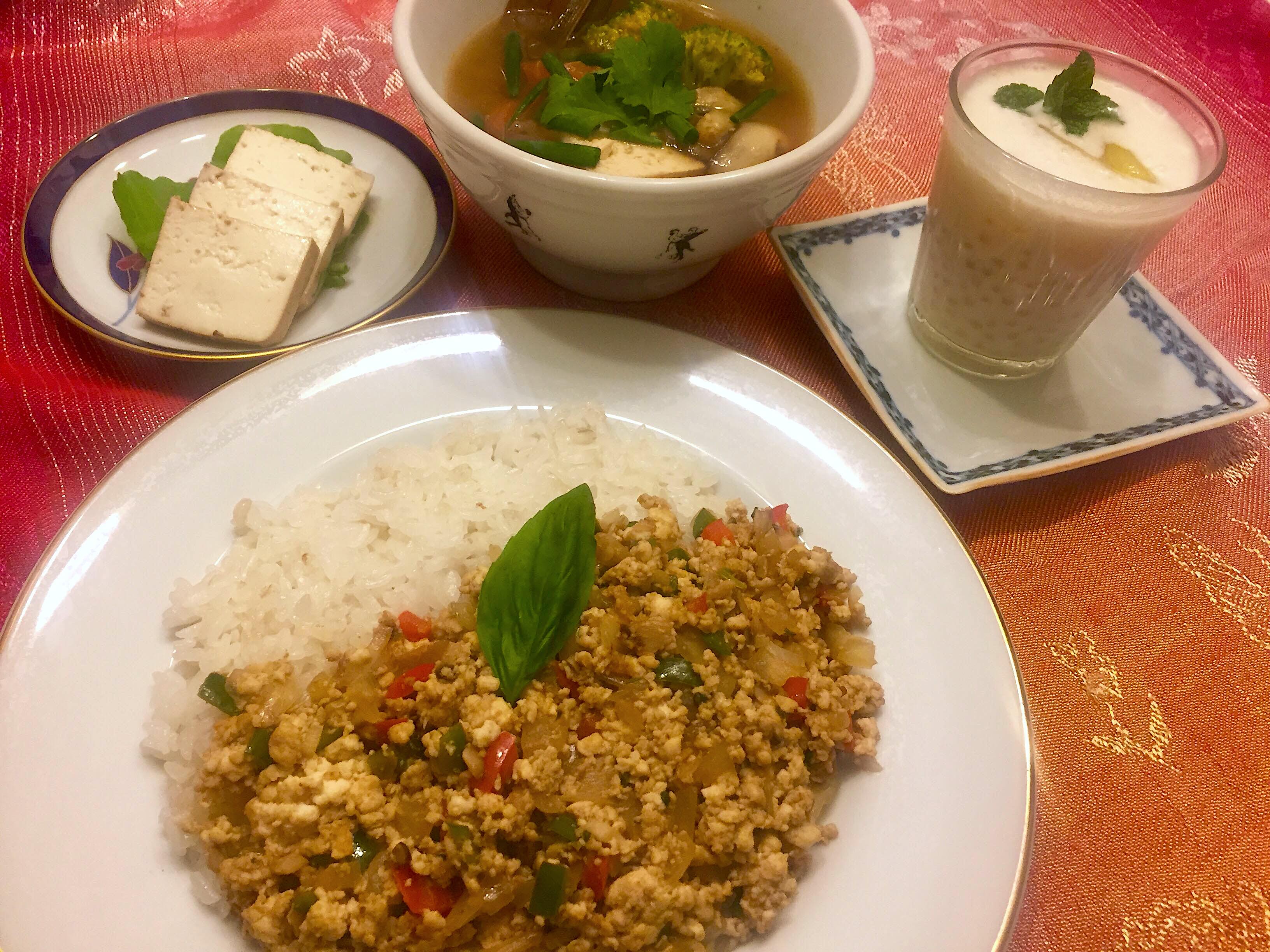 We will be making Gapao Rice, Tom Yum Soup, Marinated Tofu, and Tapioca Coconut Dessert. All of the dishes will be VEGAN of course.